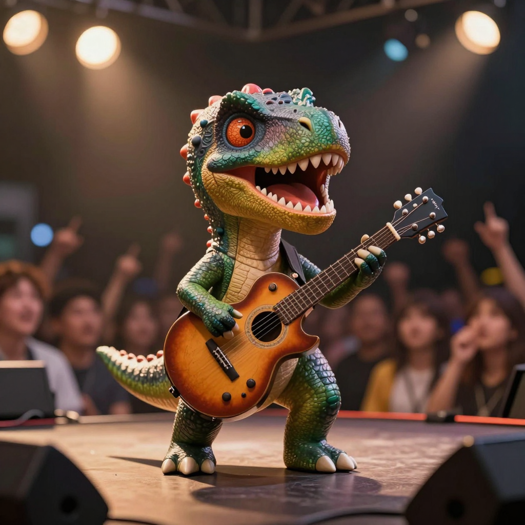“A tiny dinosaur with a guitar rocking out on a stage in front of a crowd like a rockstar.”